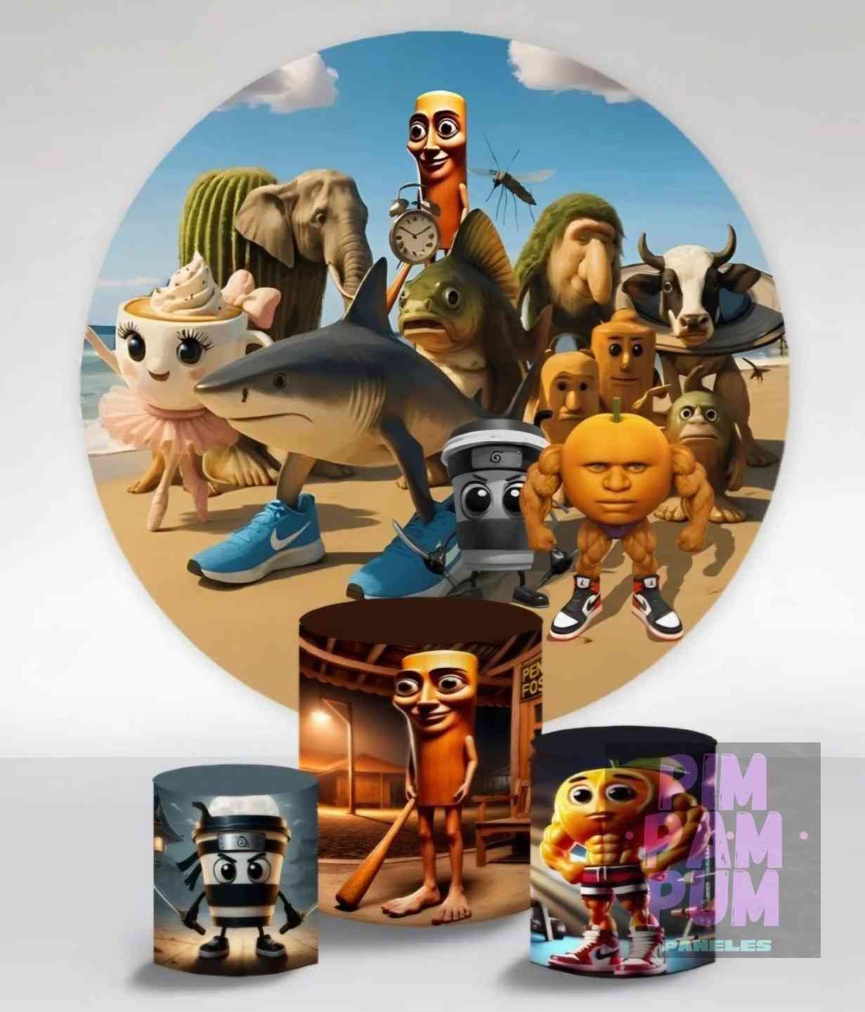 Este kit incluye un panel redondo circular y fundas para mesas con los personajes más populares de este fenómeno, como Tralalero Tralala, Bombardiro Crocodilo, Ballerina Cappuccina, Tung Tung Tung Sahur, Brr Brr Patapim, Lirili Larilá, Chimpanzini Bananini,Frigo Camelo, Cappuccino Assassino y Tatatata Sahur,