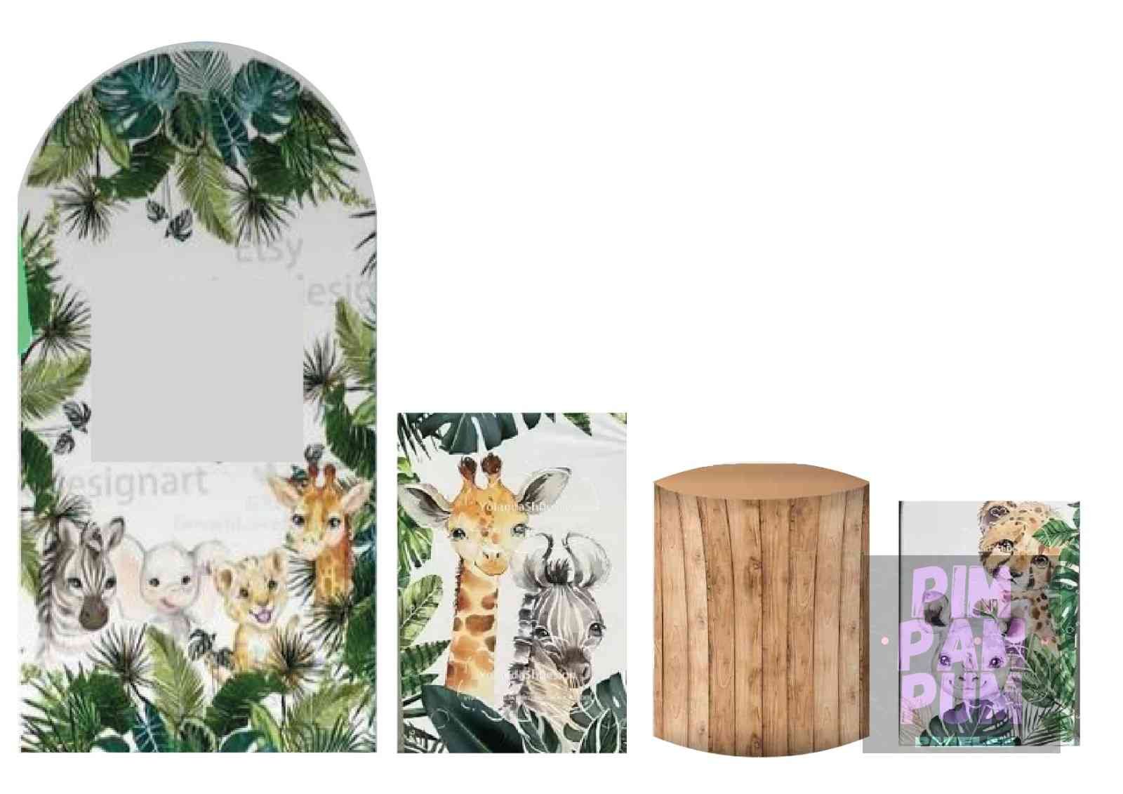 Inspira un ambiente de aventura salvaje con este panel romano y fundas para mesas de Safari, ideal para decoración de fiestas llenas de naturaleza y exploración.
